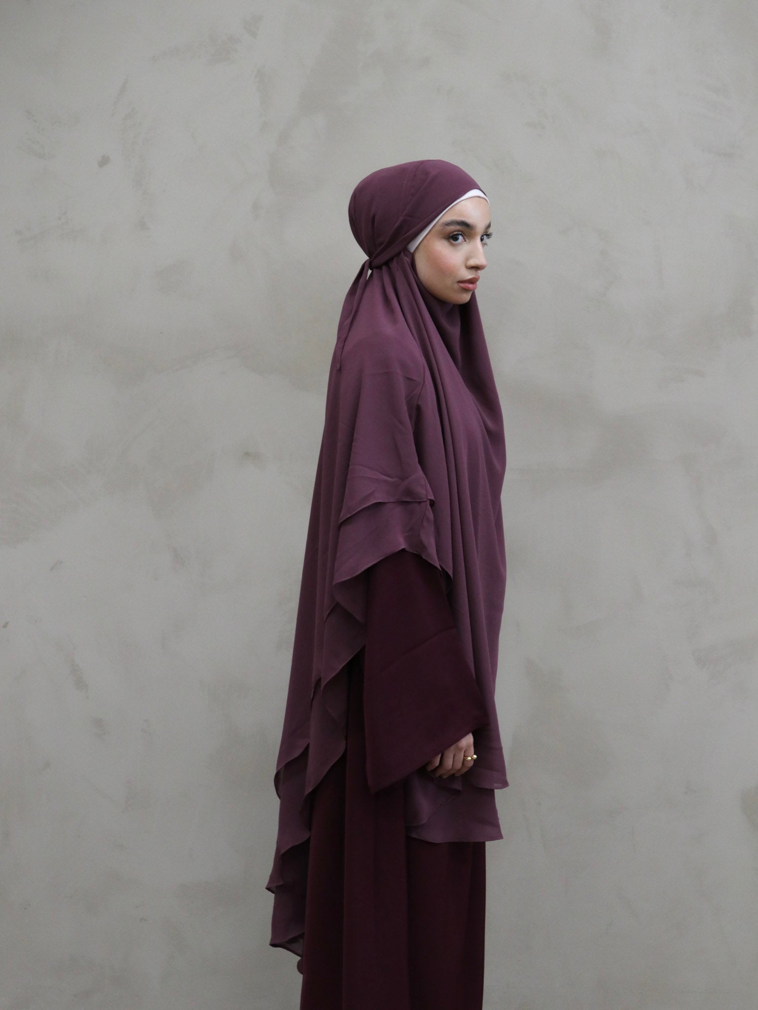 This beautiful flowy, deep lavender khimar is made of luxurious chiffon. Double-layered with an integrated niqab, classic covering underneath the chin, and a tie back incorporated.