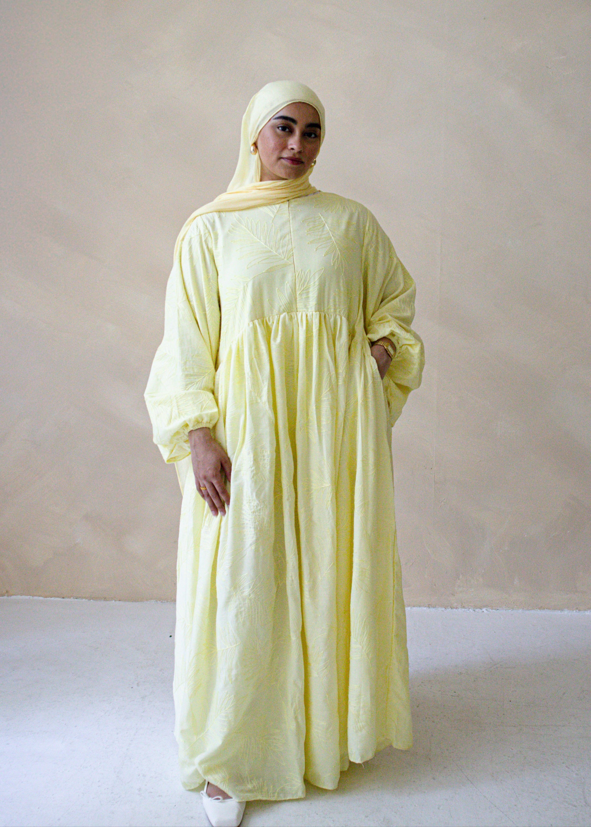 Bring a soft touch of sunshine to your wardrobe with the Butter Yellow Abaya. Crafted from 100% breathable cotton.