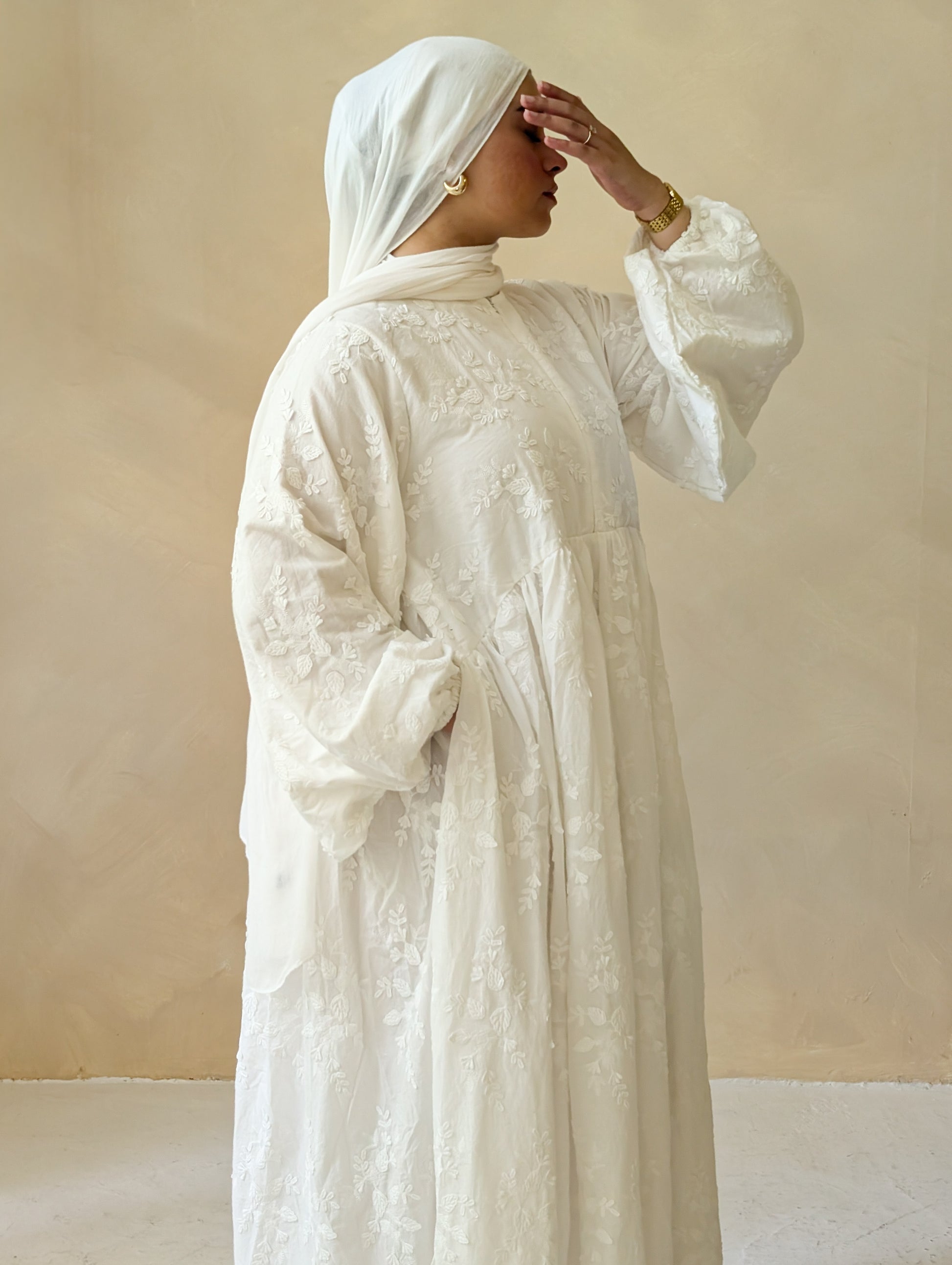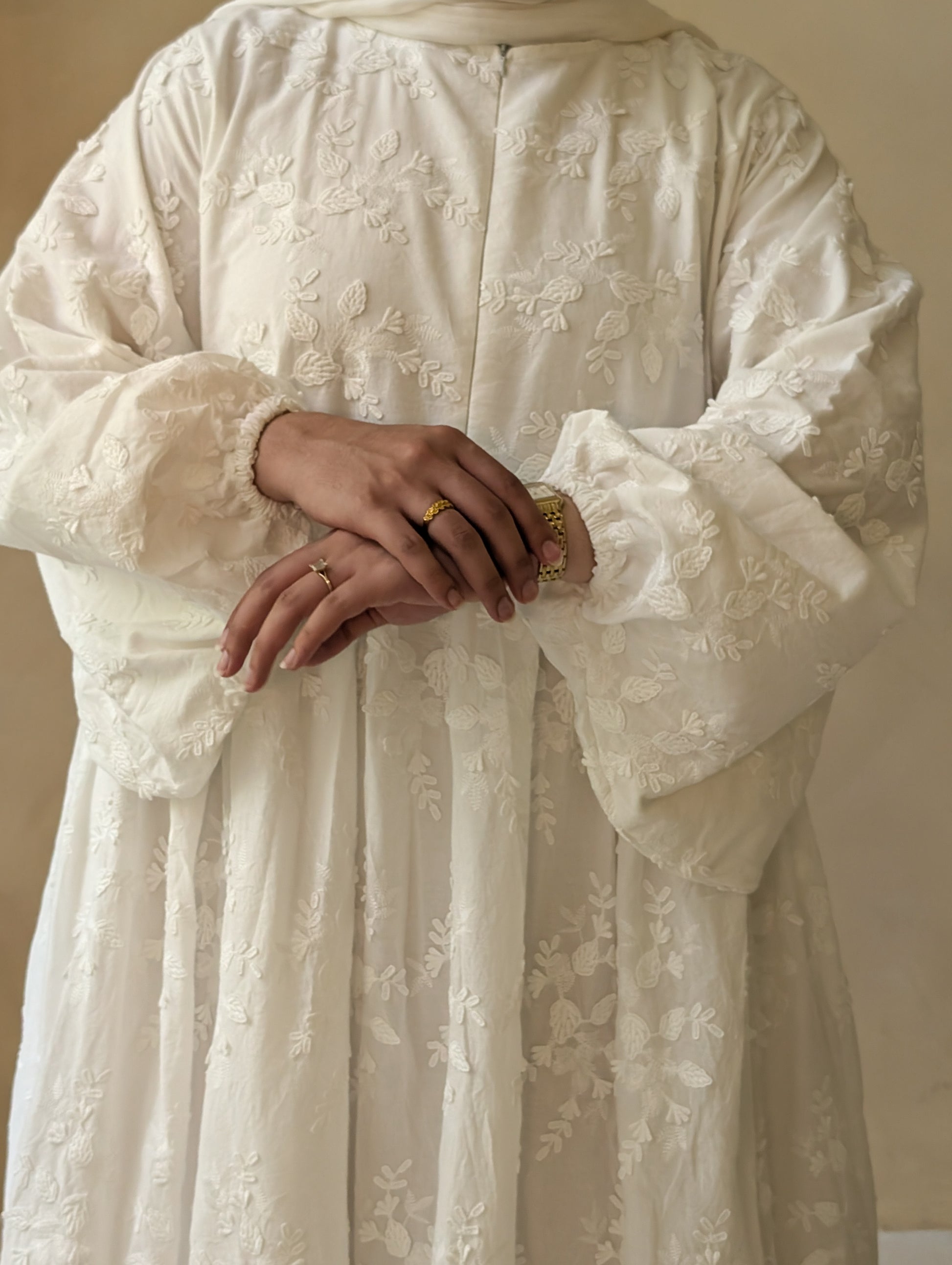The White Vines Abaya blends elegance with everyday practicality. Crafted from 100% breathable cotton, this abaya features a soft flowy silhouette with delicate vine-inspired detailing. Its nursing-friendly openings provide discreet access for mothers, making it the perfect choice for comfort and modesty.